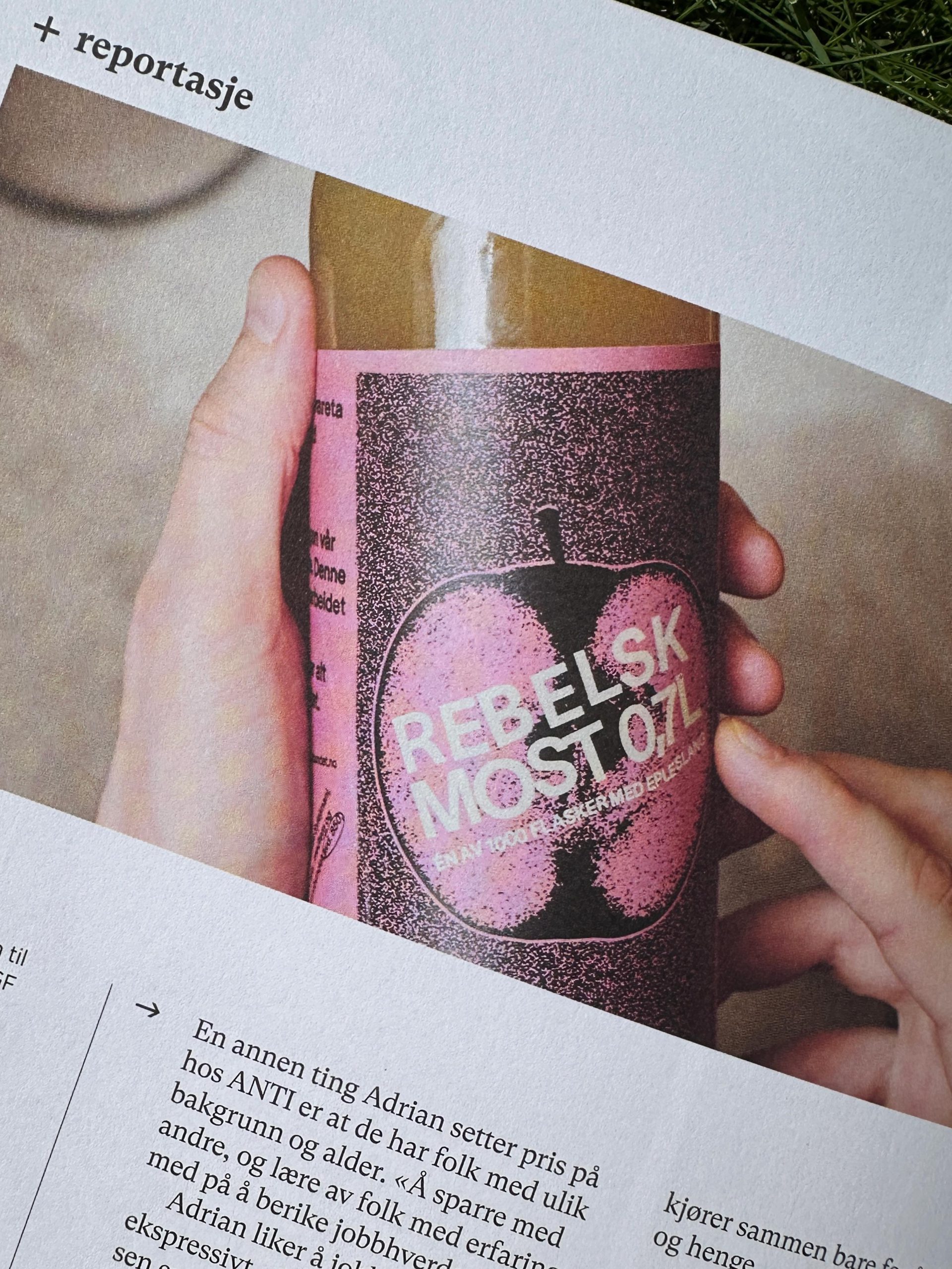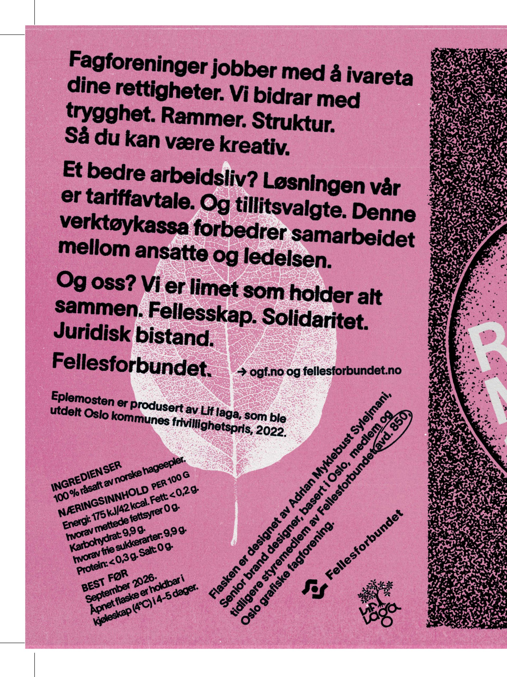 For det tredje året på rad designer vi vår helt egen eplemost. Fjorårets flaske er designet av Adrian Myklebust Sylejmani. Senior brand designer, basert i Oslo, medlem og tidligere styremedlem av Fellesforbundet avd. 850, Oslo grafiske fagforening.